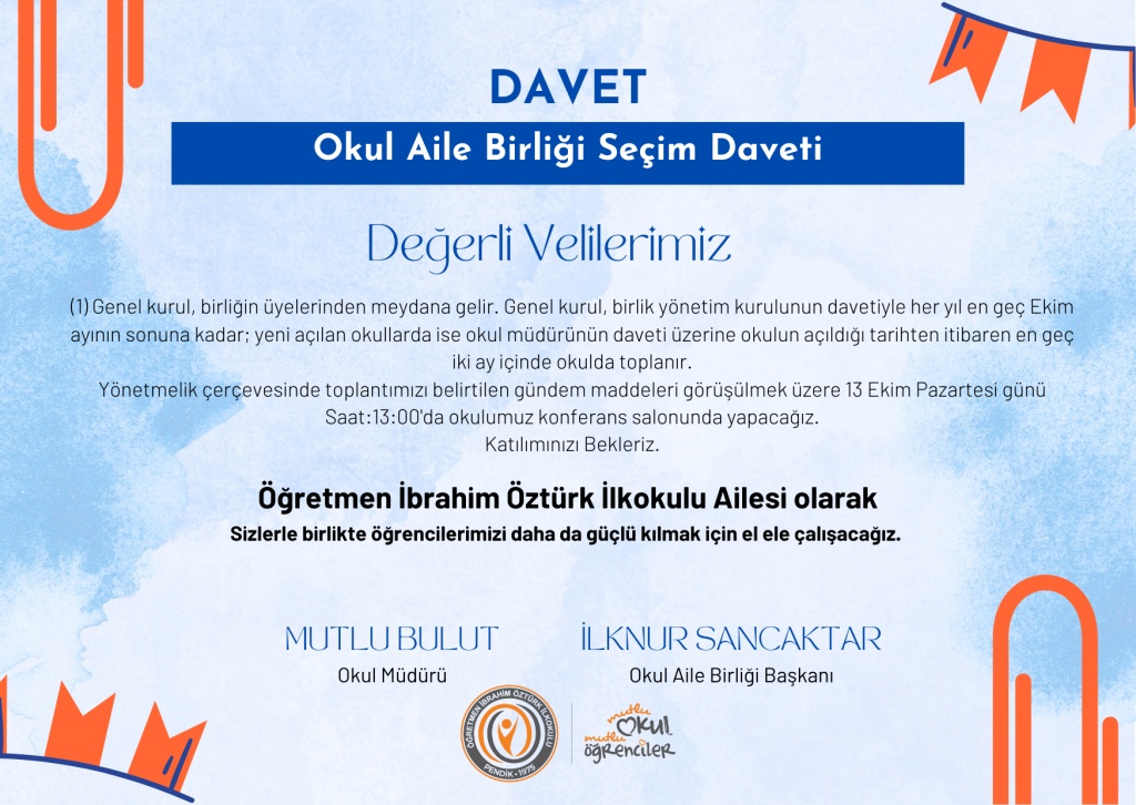 Yönetmelik çerçevesinde toplantımızı belirtilen gündem maddeleri görüşülmek üzere 13 Ekim Pazartesi günü Saat:13:00'da okulumuz konferans salonunda yapacağız.